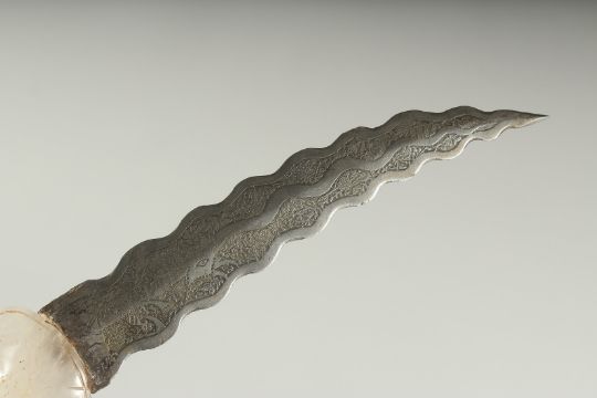 A CARVED ROCK CRYSTAL HILTED DAGGER, the handle formed as a bird head with wavey engraved blade, 37cm long.