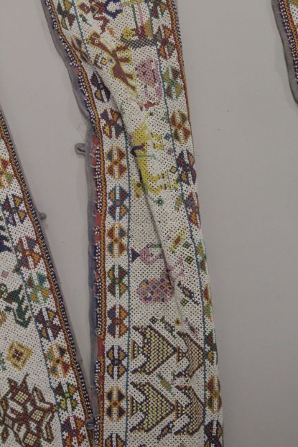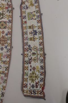 Gujarati beadwork was traditionally made by the Kathi women in Kutch. The craft arose from the trade in Murano beads amongst Indians in Zanzibar. For a note on beadwork in Kutch, see John Gillow and Nicholas Barnard 'Traditional Indian Textiles', London 1991, p.63. This example is exceptionally long. For a similar, smaller beadwork band in the Museum of Applied Arts and Sciences, Sydney, see Inv.No.96/274/3