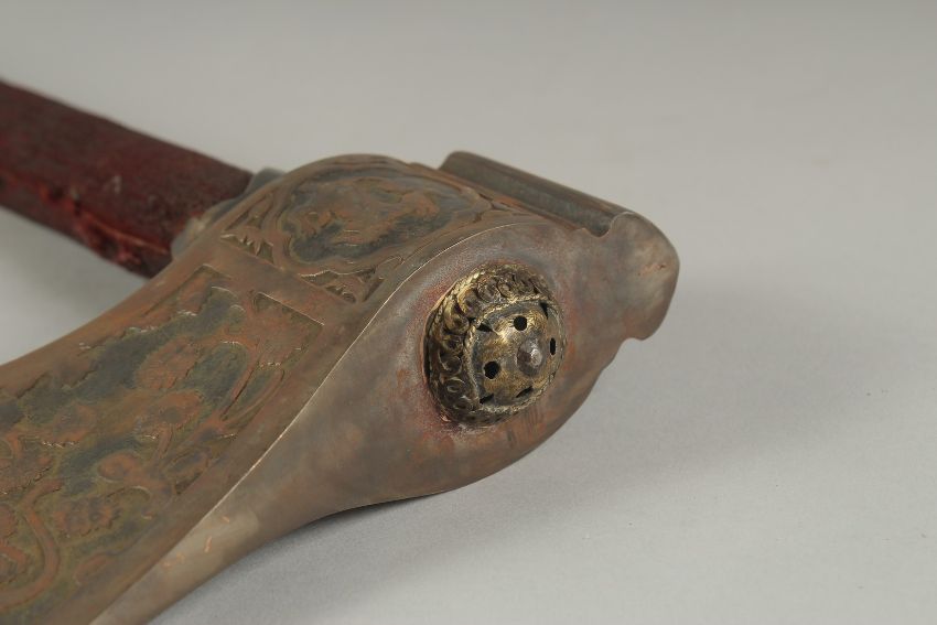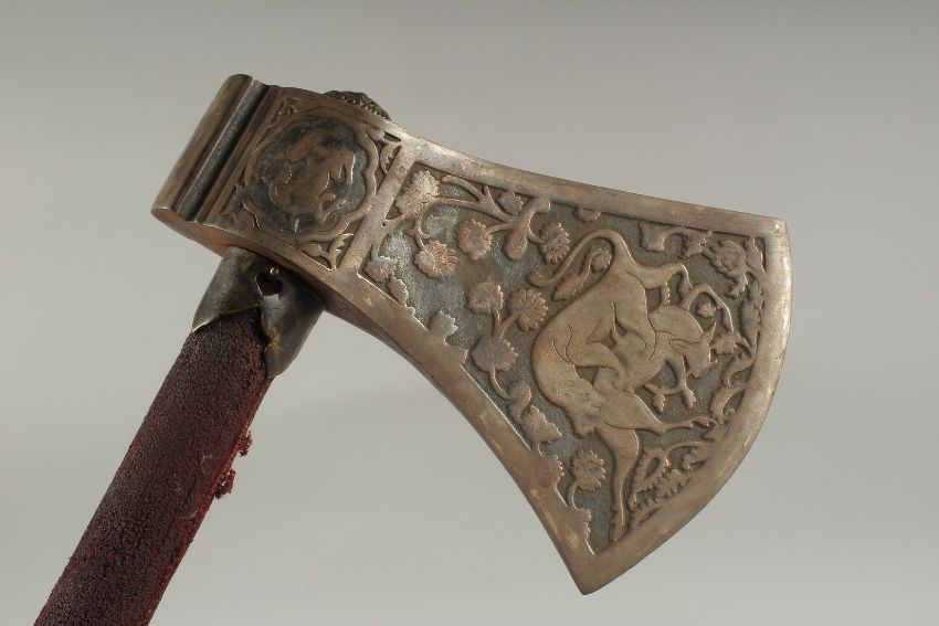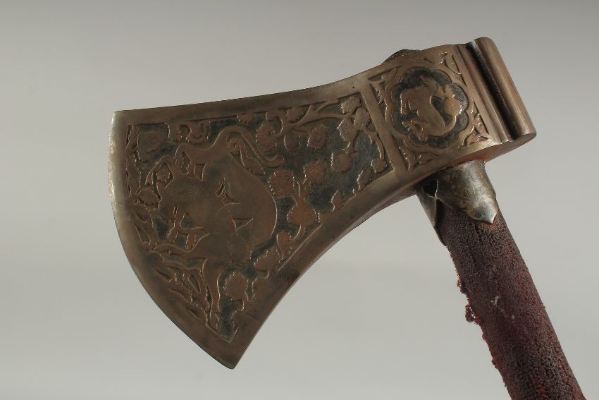 A FINE LARGE 19TH CENTURY PERSIAN AXE, the blade depicting animals and flora, 74cm long.