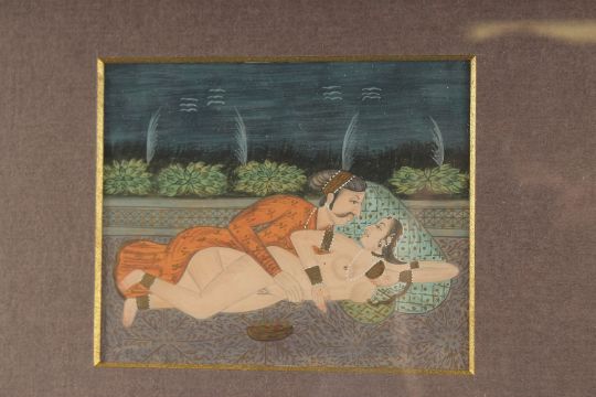 A FINE COLLECTION OF SIX INDIAN EROTIC MINIATURE PAINTINGS, each uniformly framed and glazed, (6).