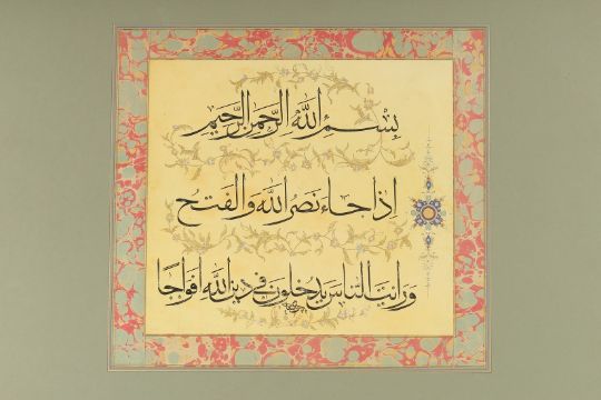 A PERSIAN CALLIGRAPHIC PAINTING, dated 1422, 50.5cm x 62.5cm.