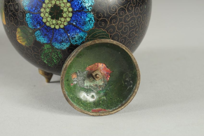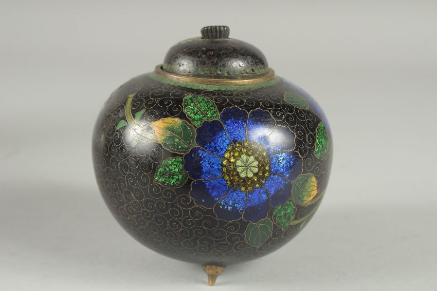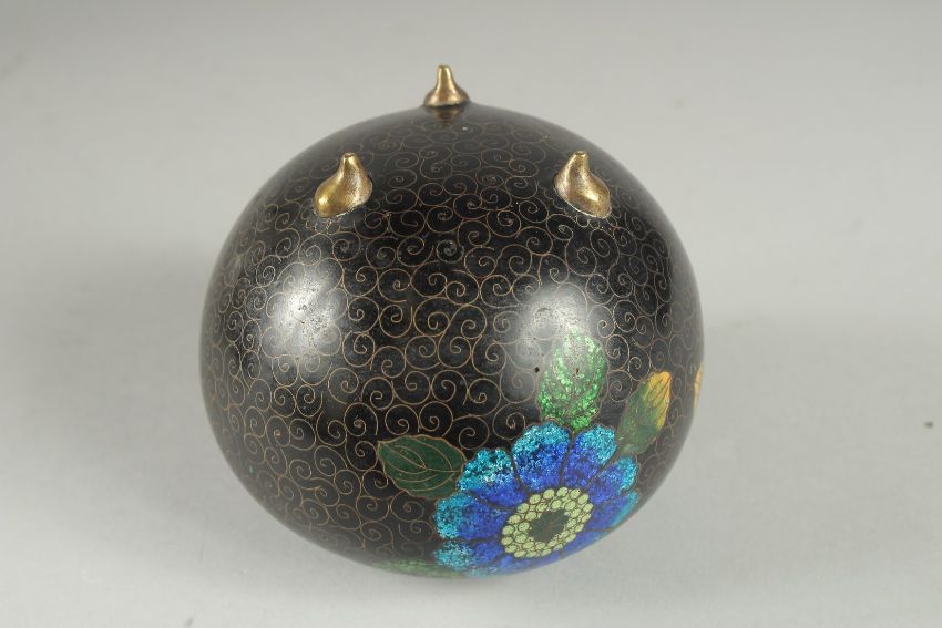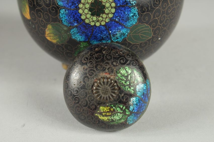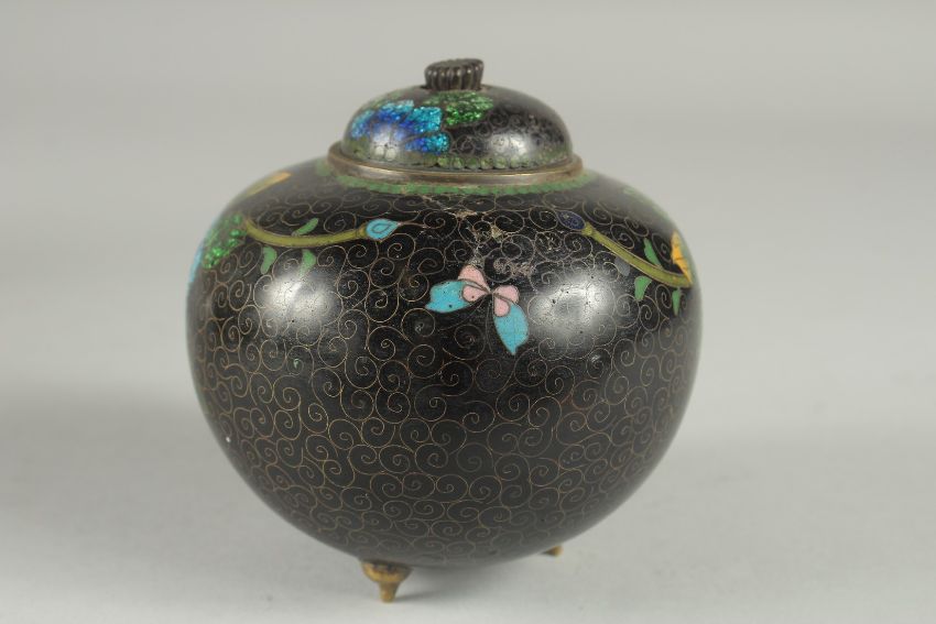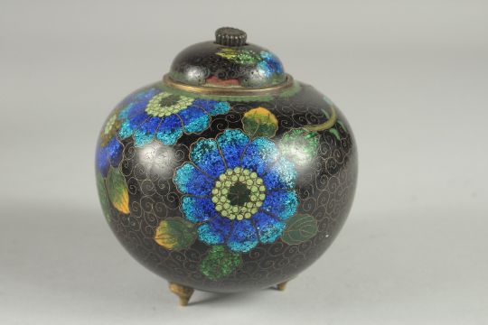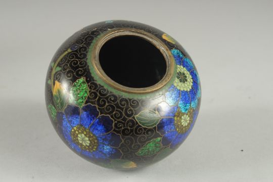 A BLACK GROUND CLOISONNE JAR AND COVER, with glittered enamel flowers, 11cm high.