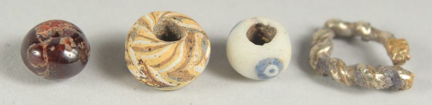 THREE BYZANTINE BEADS, together with a small white gold ring, (4).