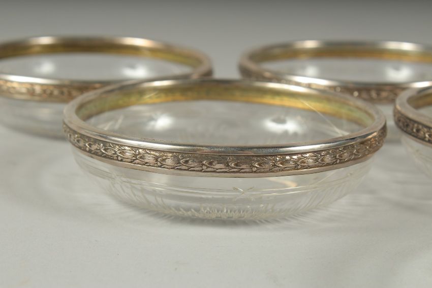 A SET OF EIGHT CONTINENTAL GLASS BOWLS with silver bands, .800. 4ins diameter.