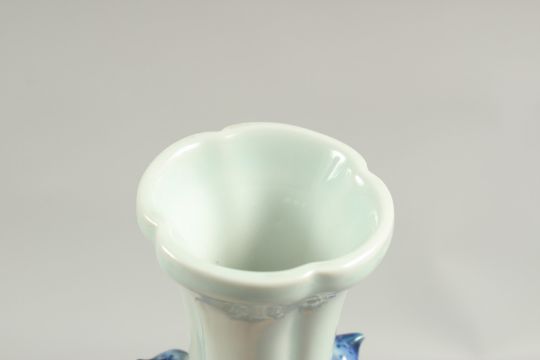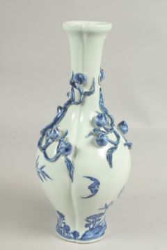 A CHINESE BLUE AND WHITE PEACH VASE with peaches in relief, square blue mark. 12ins high.