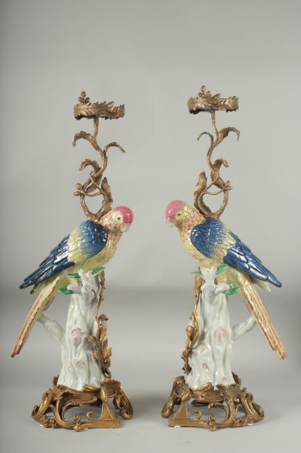A GOOD PAIR OF BLUE PORCELAIN PARAKEET CANDLESTICKS with gilt metal candle holders, standing on a tree stump.