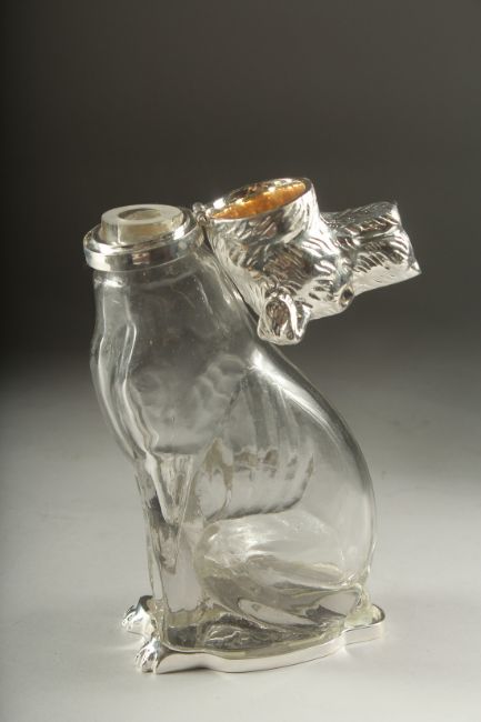 A GLASS CLARET JUG formed as a dog with silver plated head.