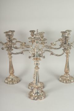 A SUPERB SET OF FOUR OLD SHEFFIELD PLATE, TWO BRANCH CHANDELIERS adapted to stack to a five light candelabra and a pair of single sticks.