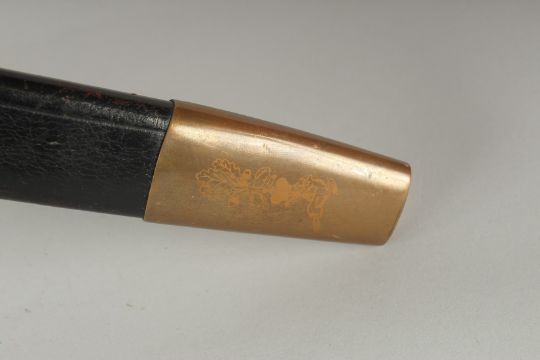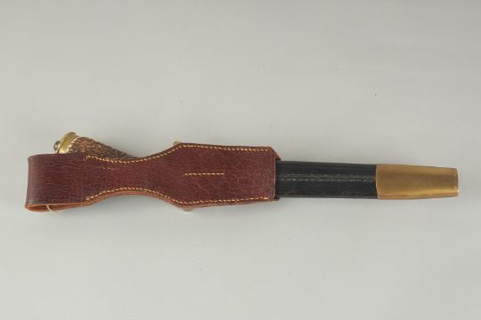 A GERMAN KNIFE with engraved, 8.5ins blade. VIVE LE ROX ET SES CHASSEURS with bone handle, in a leather sheath.