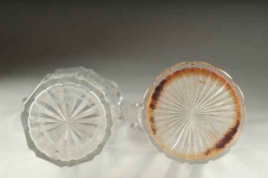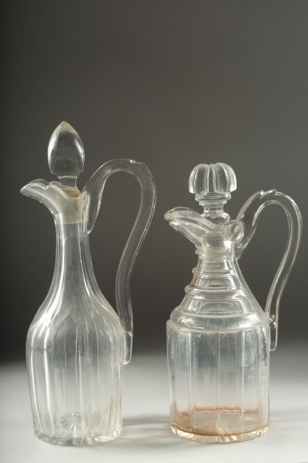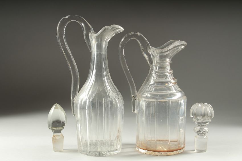 TWO HEAVY CUT GLASS CLARET JUGS AND STOPPERS.