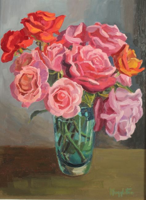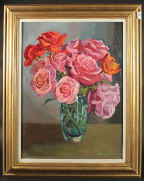 Muggleton (20th Century), A still life of pink and orange roses in a blue glass vase, oil on board.