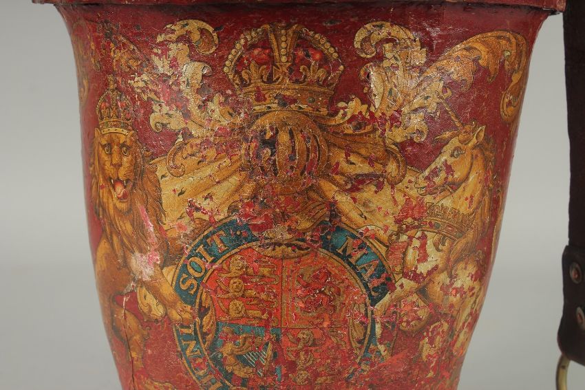 AN EARLY LEATHER METAL BOUND FIRE BUCKET with Royal Crest.