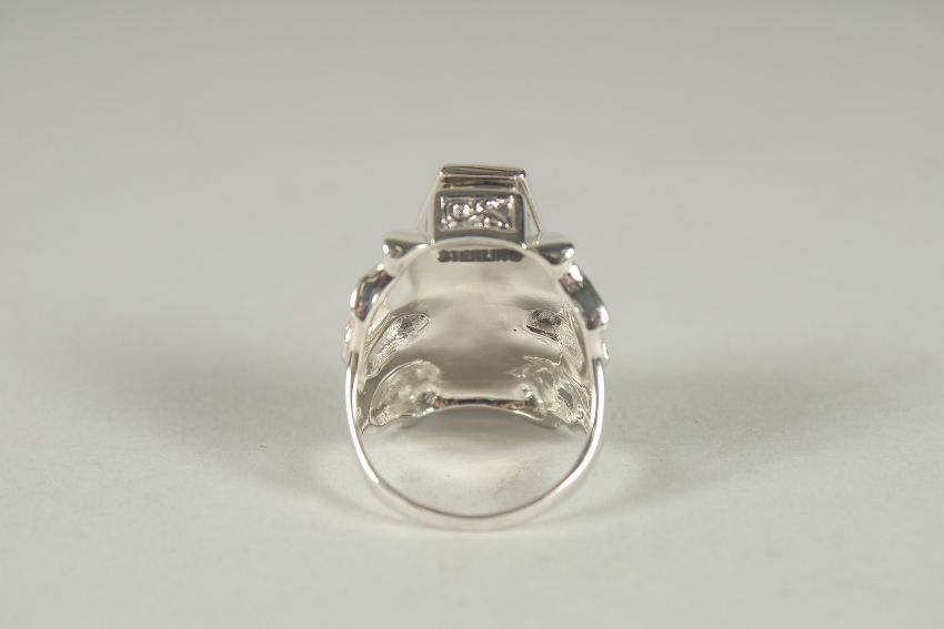 A SILVER COFFIN AND BAT SKELETON RING.