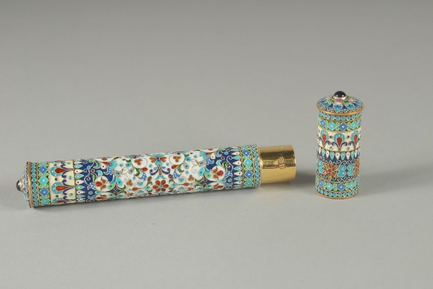A GOOD RUSSIAN SILVER AND ENAMEL CIGAR HOLDER.