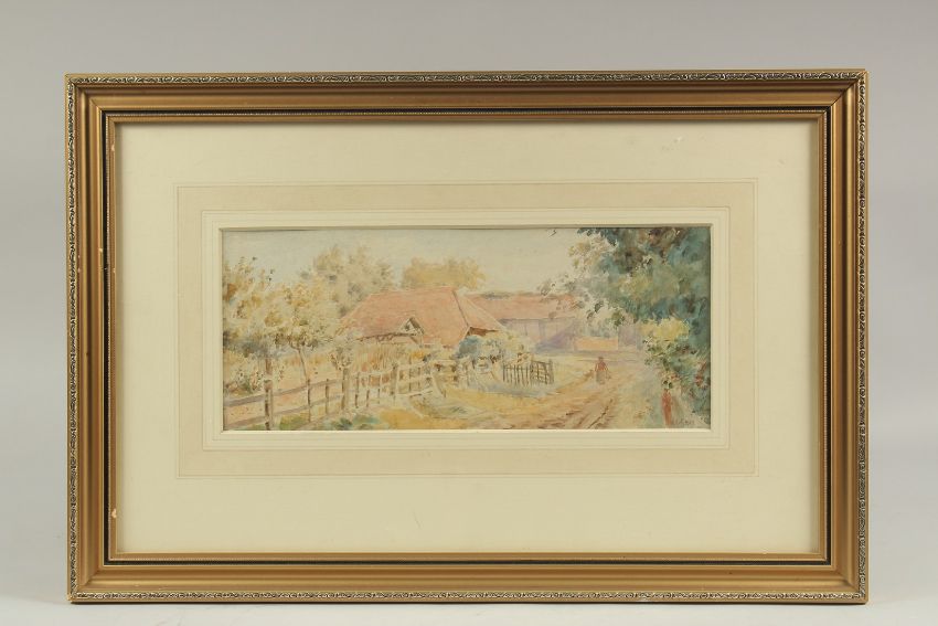 Figure on a path by farm buildings, watercolour.
