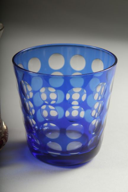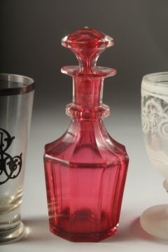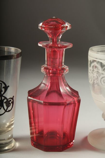 A SMALL RUBY DECANTER AND STOPPER, silver overlay beaker, a knop beaker and a blue and white beaker and etched goblet. (5).