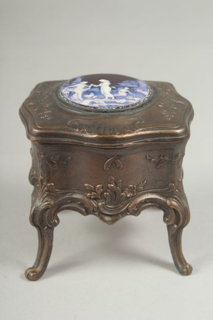A small bronze trinket box with enamel circular pendant, 9cm wide.