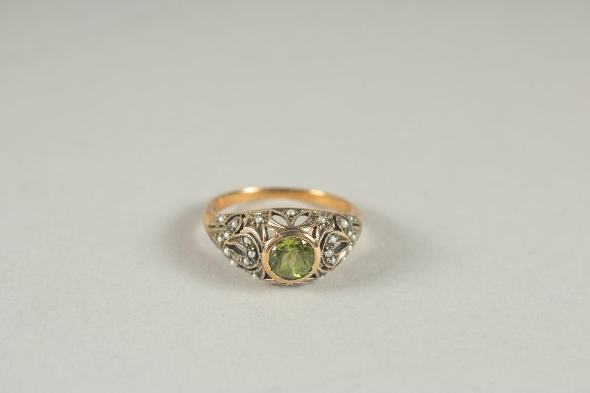 A 9CT GOLD PERIDOT AND PEARL RING.