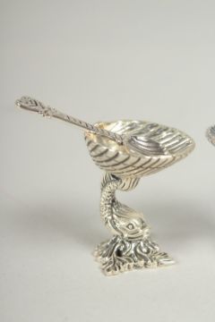 A good pair of silver dolphin salts and spoons, 3.5cm.
