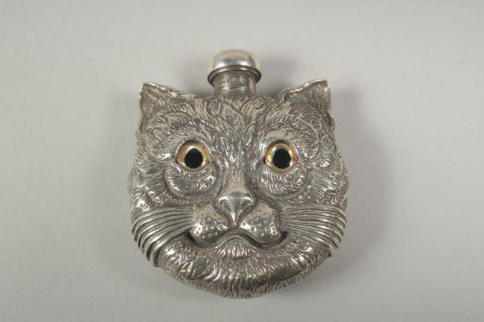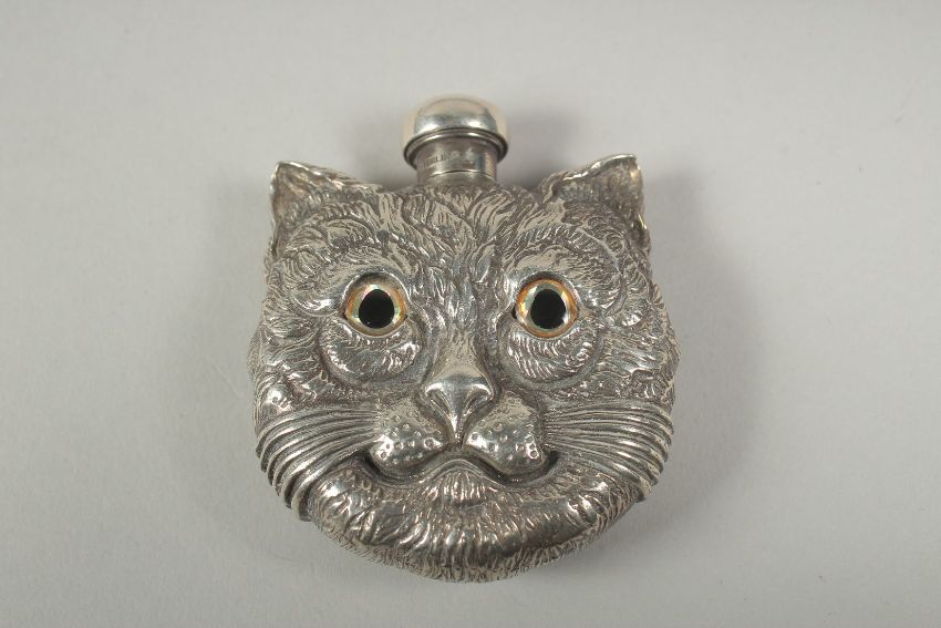 A heavy silver plated double sided cats head perfume bottle, 5cm diameter 63 grams.