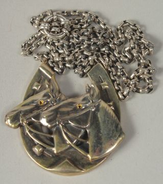 A heavy silver horses head and shoe necklace and chain in a box.