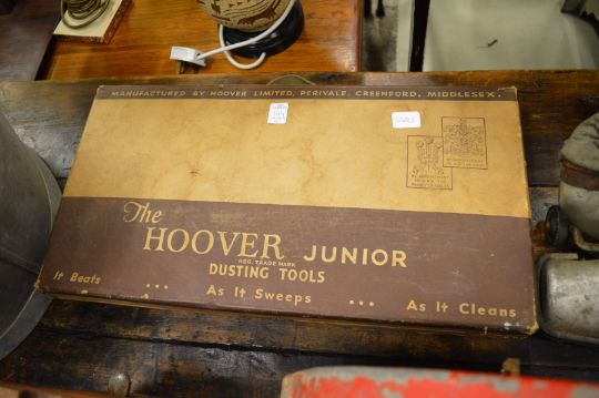An old Hoover Junior vacuum cleaner with original boxed accessories.