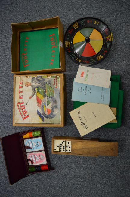 A boxed Poolette roulette style game together with bone and ebony dominoes and boxed set of playing cards and coloured chips.