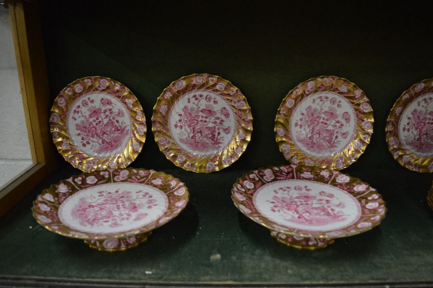 A Copeland China porcelain dessert service comprising, twelve plates, four low comports, one tall comport, all with gilded borders, sepia painted with Japanese prunus tree design (one comport top detached).
