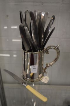 A plated tankard and a small group of knives.