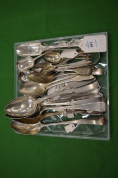 A good collection of Georgian and other silver spoons, cheese scoop, tea caddy spoon etc.