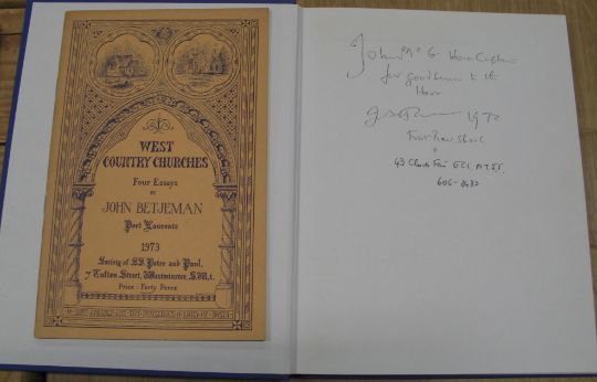 JOHN BETJEMAN SIGNED PRESENTATION COPIES. A collection of materialincluding: (1) Collins' Guide to English Parish Churches, Ed. John Betjeman, 8vo, clo., d.w. (scrappy, Sellotape repairs, L., Collins, 1958, SIGNED & INSCRIBED "To John [McGlashan], Waddesden, Bucks, 1972, one hot July day," on p. 103 is a small stain by which Betjeman has written "gin spilt by John Betjeman, 6/7/72." (2) London's Historic Railway Stations, By John Betjeman, photographs by John Gay, no d.w., 1st Edn., L., John Murray,1972, SIGNED & INSCRIBED, "John McGlashan Horn Captain, for good service to the Horn, John Betjeman 1972 (with "Cloth Fair" address and phone number." (3) Summoned By Bells, L., John Murray, reprint, 1974 SIGNED & INSCRIBED, "To John McG MCMLXXVI Johannes Betjeman me fecit," together with 9 colour PHOTOS from the filming of the TV programme, and a copy of a letter from Betjeman to Jonathan Stedall with his response to the film and details of a Centenary Tour. (4) A Pictorial History of English Architecture, By John Betjeman, no d.w., 1st Edn., L., John Murray, 1973, SIGNED & INSCRIBED, "John McGlashan All the Best [rest illegible] plus JB signature. (5) West Country Churches. Four essays by John Betjeman, 8vo booklet, card covers, Soc. of Saints Peter and Paul, 1973, SIGNED & INSCRIBED, "John Betjeman for John McGlashan 1973." (6) "First and Last Loves," paperback, SIGNED, INSCRIBED, and dated 1972. (7) an L.P. Record, "Late Flowering Love," the cover SIGNED & INSCRIBED. (8) an L.P. Record, "Banana Blush," SIGNED & INSCRIBED, and with a pen doodle self-portrait by Betjeman, captioned, "Oh that I had more hair." PROVENANCE: by descent from John McGlashan (New-Zealand born, died aged 86, in 2021), renowned BBC (& then independent) CAMERAMAN. In the 1950's he worked with directors Ken Russell, John Schlesinger , and Ken Loach (among others) on the arts programme "Monitor." Further credits included "The Ascent of Man" (1973) and "The Shock of the New" (1980), and in the late 70s, TV shows such as "Porridge" and "Doctor Who." during Tom Baker's era. A highlight for John was working with the poet John Betjeman on "A Passion for Churches "(1974), "Metro-Land" (1973), and "Summoned by Bells" (1976). The two shared a love of churches, had other shared interests, and became firm friends. Betjeman occasionally referred to him, but lovingly, e.g. in his correspondence, as "the Bishop." Among John McGlashan's final work as an independent cameraman, were the popular TV shows "Monarch of the Glen," (Director of Photography 2003-2005) and several episodes of "Silent Witness." (9)