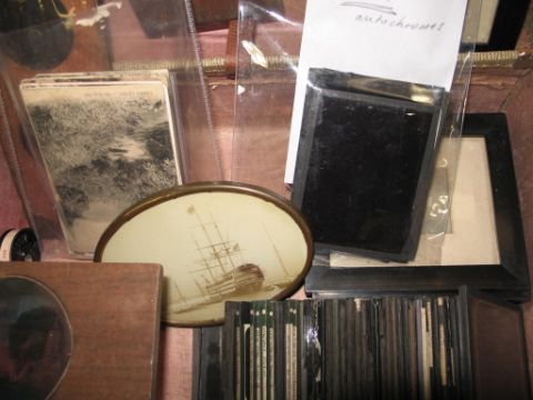 PHOTOGRAPHY: a small suitcase of magic lantern slides, some in wooden frames, four small framed photos, two Pathescope miniature films about Native Americans and Yellowstone Park, a framed photo of a ship and a quantity of world postcards.