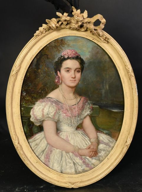 Late 19th Century French School, a portrait of a lady with pearls in a formal park, oil on canvas, 16" x 12.75" (40 x 32.5cm).