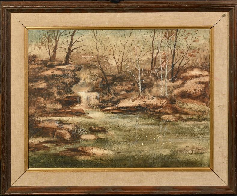 Leist, 20th century, a waterfall in a stylised landscape, oil on board, signed, 14" x 18" (36 x 46cm).