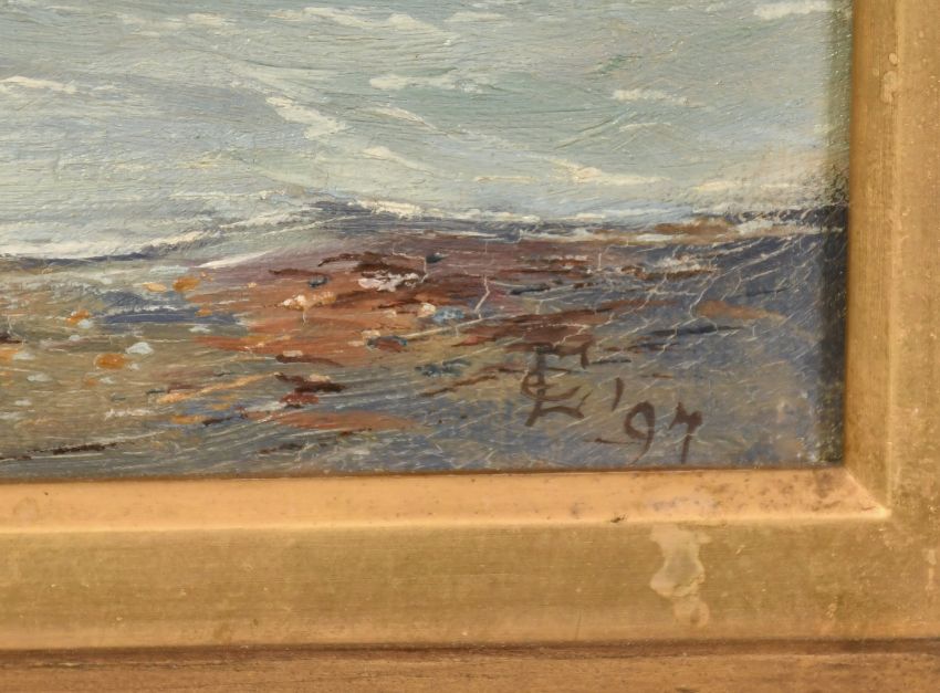 English School, Circa 1897, ships passing on a horizon with seagulls on the shore, oil on canvas, signed with monogram and dated 1897, 12" x 24" (30 x 60cm).