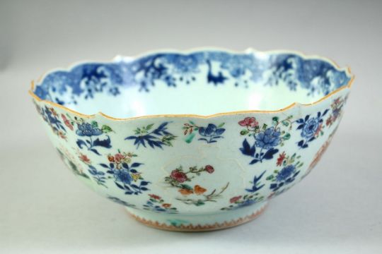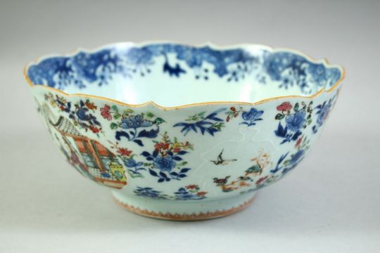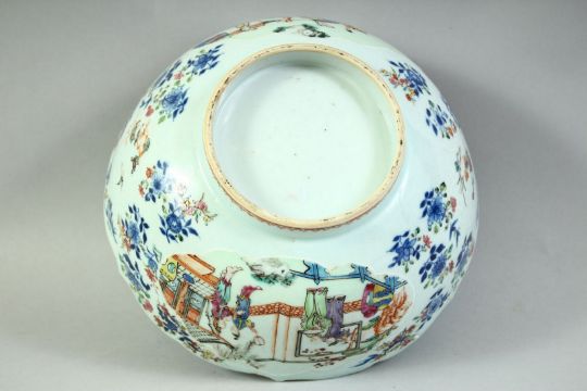 AN 18TH CENTURY CHINESE QIANLONG PERIOD PORCELAIN BOWL, the exterior painted with various figures in outdoor settings and further decorated with birds and native flora, the interior base painted with a figure playing a flute beside a dog, (with area of damage), 23.5cm diameter.