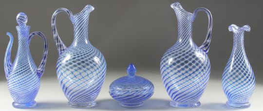A COLLECTION OF FIVE TURKISH GLASS ITEMS; comprising one decanter jug and stopper, two other jugs, a vase, and a lidded circular box, (5).