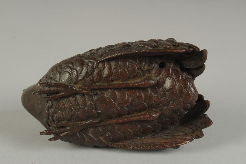 A JAPANESE BRONZE CENSER BURNER IN THE FORM OF A RESTED EGRET, with removable section to the back, 13cm long.