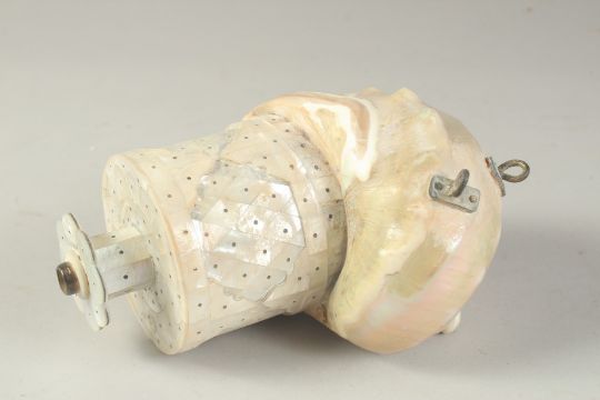 AN INDIAN GOA MOTHER OF PEARL SHELL POWDER FLASK, 19cm.