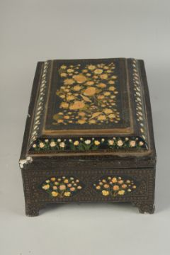 A TURKISH OTTOMAN LACQUERED WRITING BOX, with hinged lid, painted with birds and flora, 38.5cm x 26cm.