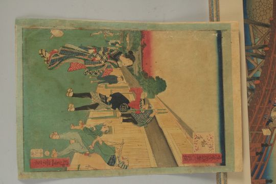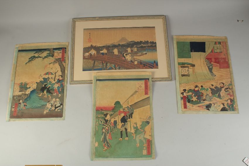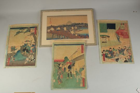 THREE ORIGINAL JAPANESE WOODBLOCK PRINTS, together with another framed and glazed woodblock print, (4).