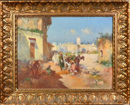 MANUEL MENSA SALAS (1875-1938) SPANISH, a pair of oil on board paintings of North African figures and horses gathered beside buildings with city views beyond, both signed, each 14.5" x 19" (37 x 48cm), (2).