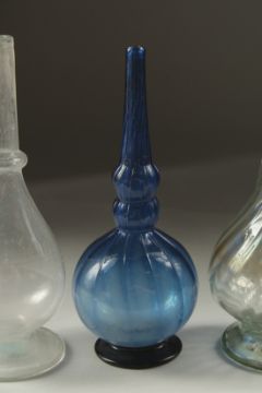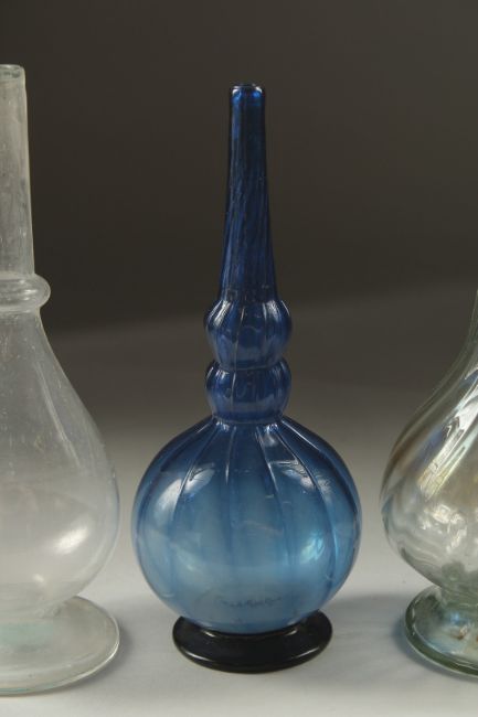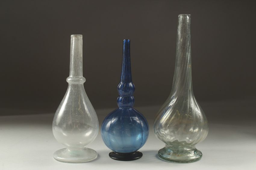 A COLLECTION OF THREE 18TH CENTURY MUGHAL INDIAN GLASS ROSEWATER SPRINKLERS, tallest 22cm high (3).