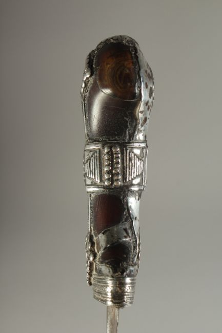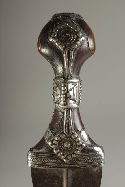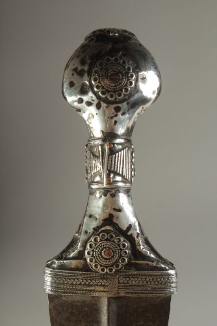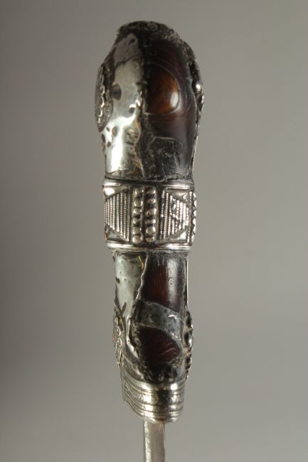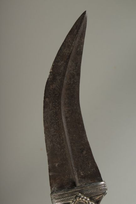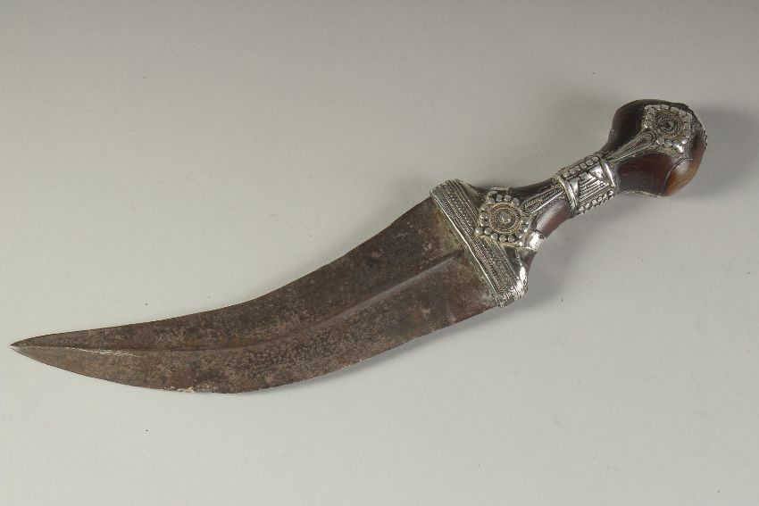 A FINE 19TH CENTURY ARAB JAMBIYA DAGGER, with silver mounted horn handle.
