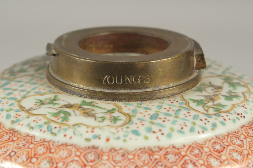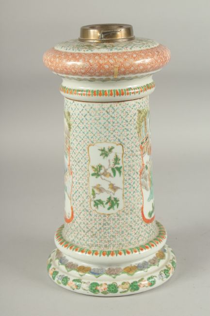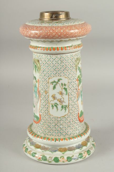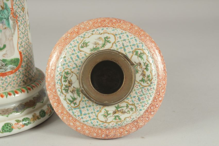 A CHINESE FAMILLE VERTE PORCELAIN LAMP, painted with panels of figures and birds, 31cm high (af).