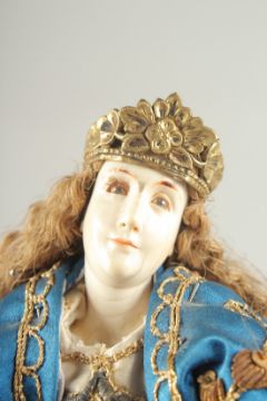 A FINE 18TH CENTURY SPANISH COLONIAL MADONNNA FIGURE, with ivory head and hands on a polychrome wooden base, 45cm high.