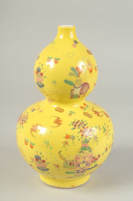 A CHINESE YELLOW GROUND POLYCHROME DOUBLE GOURD VASE, 24cm high.