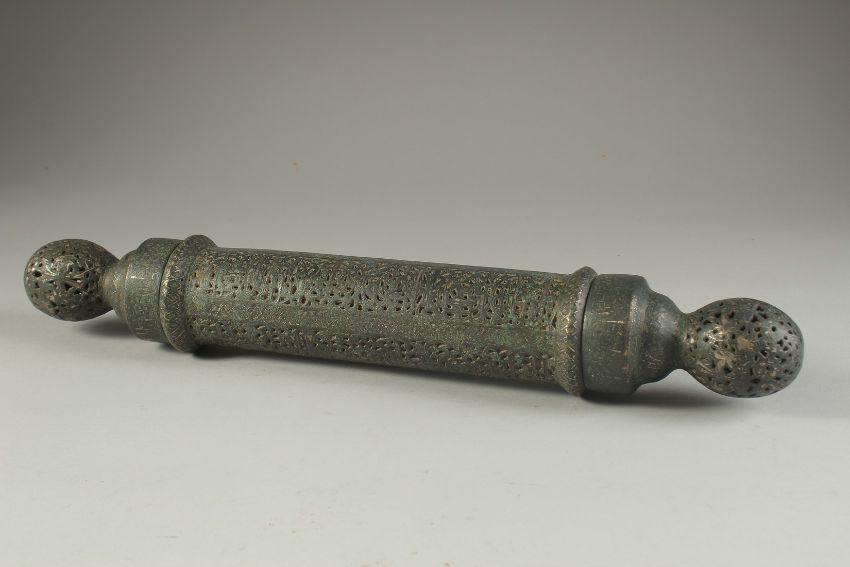 A VERY FINE EARLY ISLAMIC PERSIAN SELJUK SILVER INLAID OPENWORKED BRONZE DOCUMENT HOLDER, 41cm long.