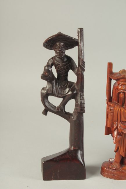 A CARVED HARDWOOD FIGURE, 30cm high, together with three other carved wood figures, (4).