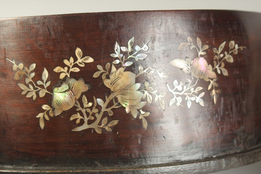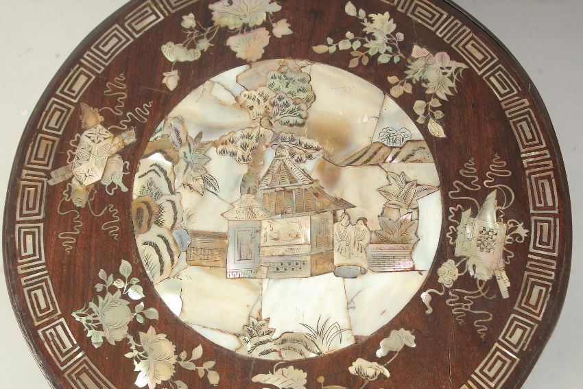 A CHINESE MOTHER OF PEARL INLAID HARDWOOD CIRCULAR BOX, inlaid all over with precious objects and decorative floral sprays, the lid with central panel depicting a scene with a temple and figures, 25.5cm diameter.